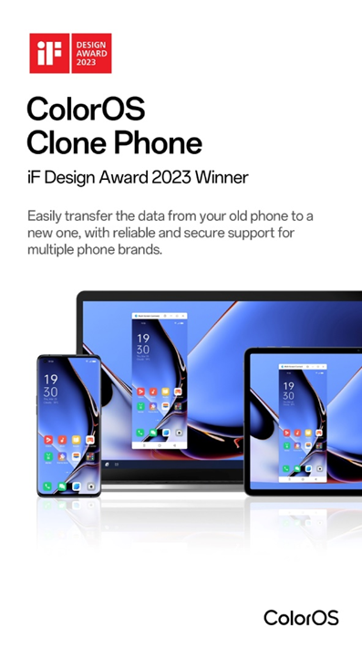Clone Phone, the software category winner of the 2023 iF Design Award, is a safe software that makes it easier to transfer data between old and new phones without the use of cables or other devices, enhancing the data migration experience while protecting user data through added security.